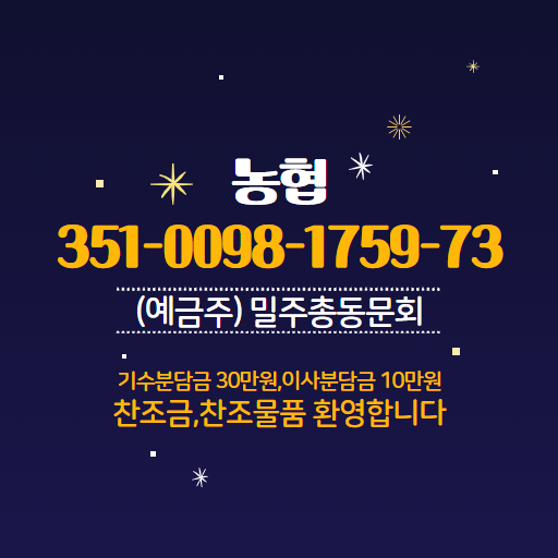 발전기금 보내실 곳: 351-0098-1759-73(예금주 밀주총동문회)