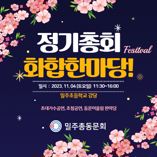 국화꽃 향기 그윽한 계절에 영원한 마음의 고향인 모교에서 밀주인이 함께하는 『제10회 정기총회 및 화합 한마당』을 아래와 같이 개최하오니 바쁘시더라도 꼭 참석하시어 깊어 가는 가을의 정취와 함께 모교의 발전과 동문의 따뜻한 정을 나누어 주시길 바랍니다.